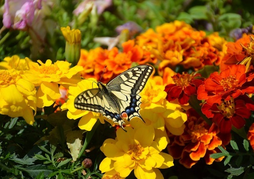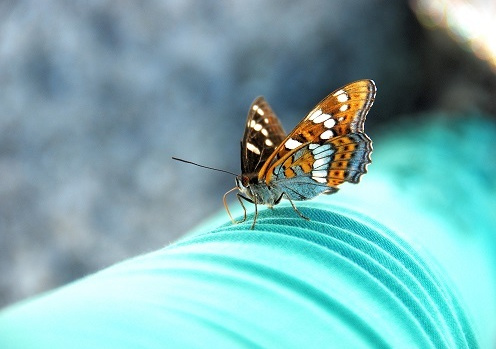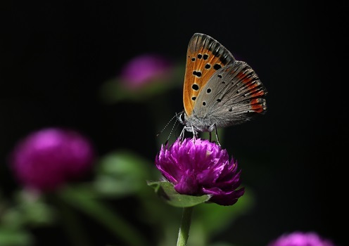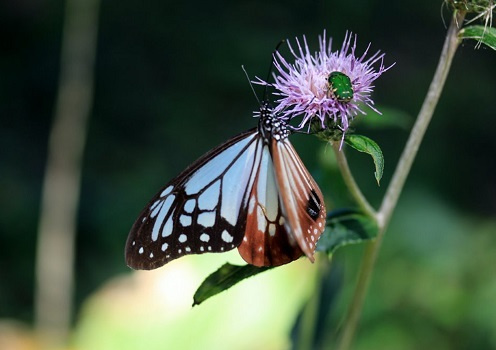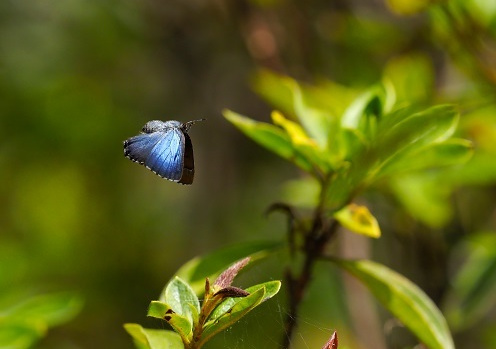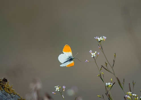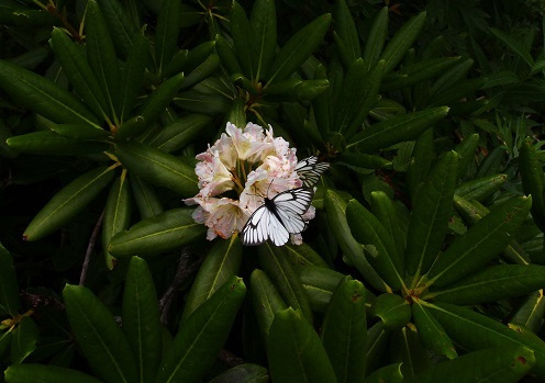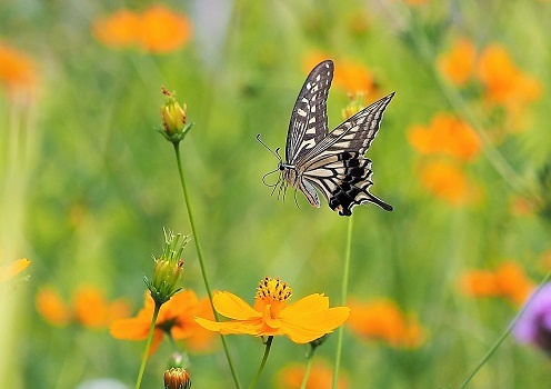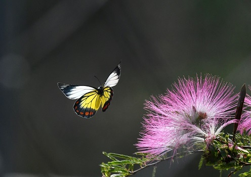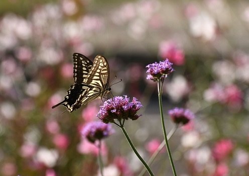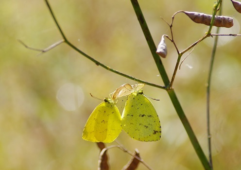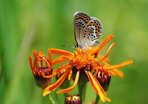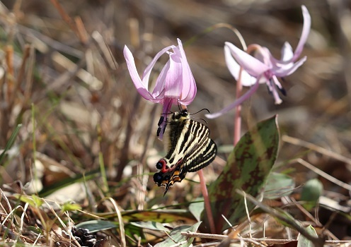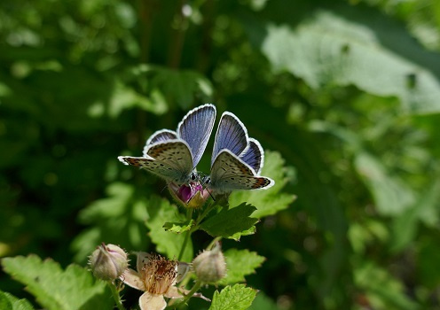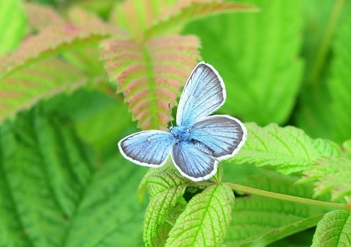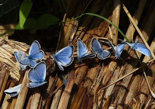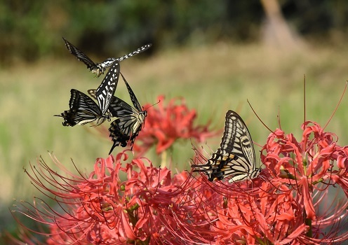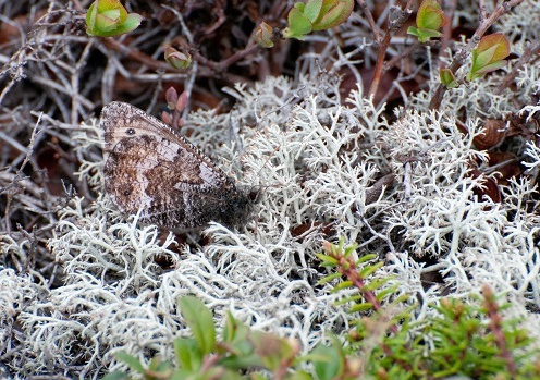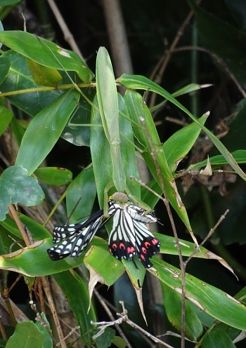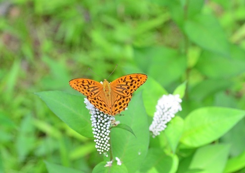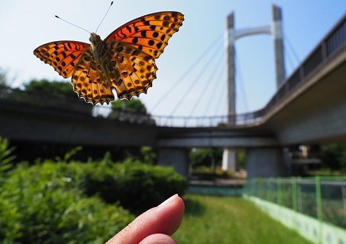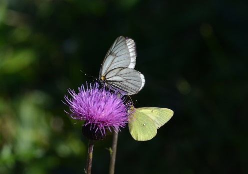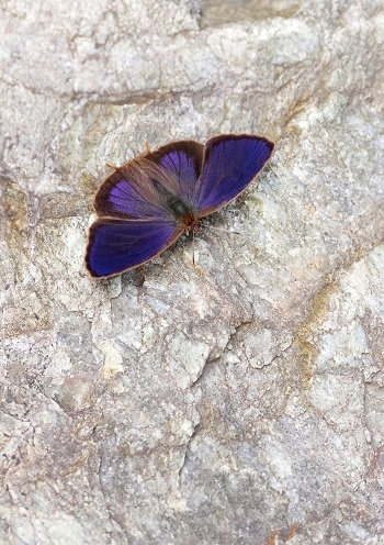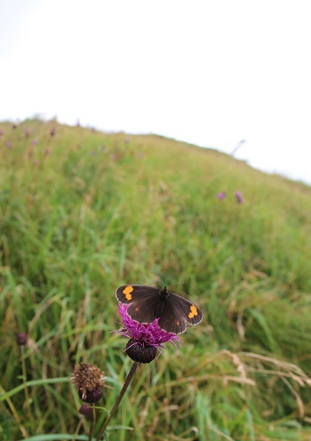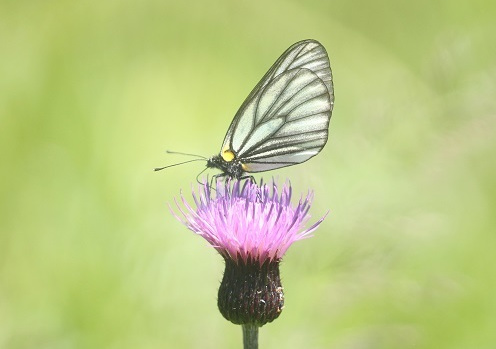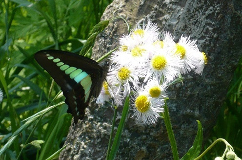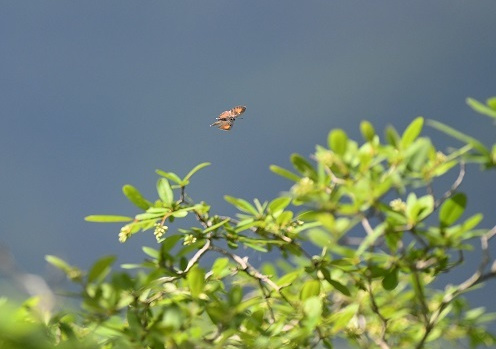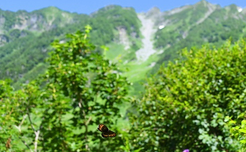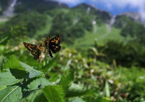 北アルプスの沢沿いの登山道を詰めて行くと、上流部の草付でタカネキマダラセセリに会うことができます。午前中、オスはイタドリや食草のイワノガヤスリなどの葉上でテリトリーを張っている姿が見られます。そこに別のオス個体が飛来するとジェット戦闘機のスクランブル発進のような勢いで飛び立ち、ごく短時間ですがオス同士が絡み合って飛ぶ姿が見られます。写真を撮った時には気が付かなかったのですが、よく見るとオスが脚同士をぶつけ合っている、まさに肉弾戦だったことに驚きました。