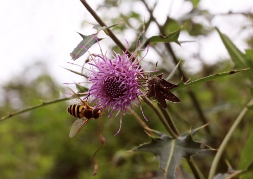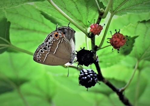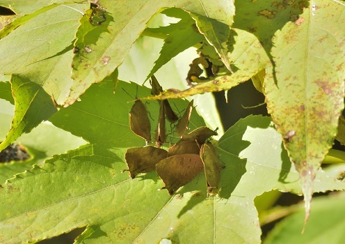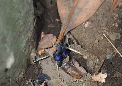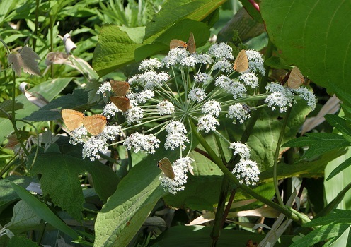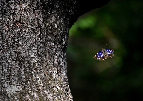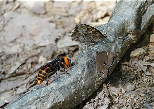 オオスズメバチが樹液を吸っていました。サトキマダラヒカゲ、クロヒカゲなどが数羽近くに寄ってきました。オオスズメバチが追い払おうとすると、サトキマダラヒカゲが猛烈に反撃。オオスズメバチに向かっていくとは凄い。この写真を撮った直後の出来事でした。