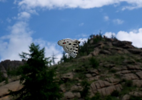 クモマツマキチョウは可憐で美しい高山蝶で、幼虫の食草ミヤマハタザオなどに良く訪花します。偶然、ミヤマハタザオの花で吸蜜するためにストローを伸ばしながら、飛びつく瞬間の写真が撮影できました。