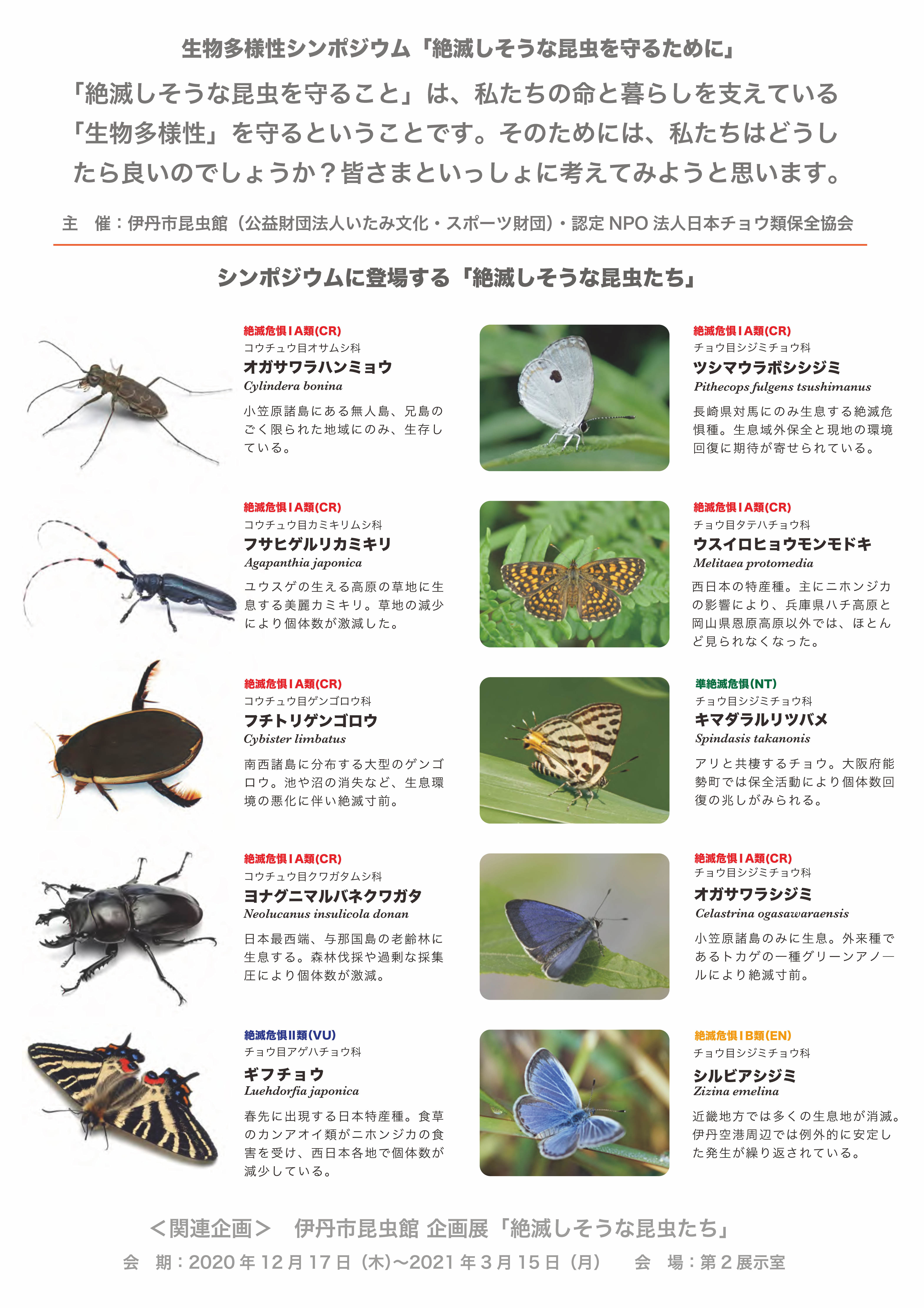 12月19日に開催いたしました「生物多様性シンポジウムー絶滅しそうな昆虫を守るためにー」は、下記のプログラムで行われました。非常にたくさんの方々にご参加いただき、誠にありがとうございました。