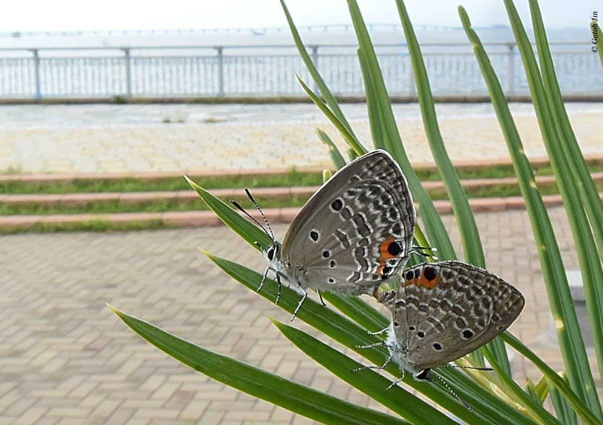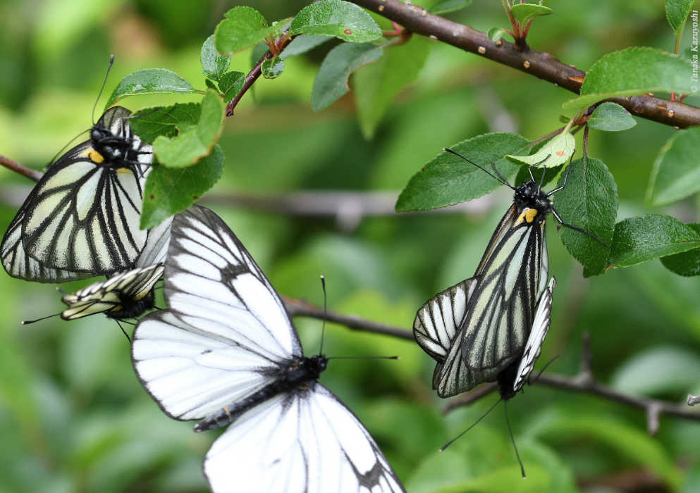自宅の周辺にはネムノキの大木が数本あり、その種子が落ち若木が自然繁殖しています。この葉っぱにキタキチョウが卵を産み付け、幼虫⇨蛹⇨羽化していきます。一本の若木から5~7匹程の羽化がみられることがあります。越冬したキタキチョウは新緑の頃から夏にかけて、またネムノキで育ち、この周辺で交尾します。その交尾をカメラで捉えることができた一枚です。交尾中のキタキチョウの表情が何とも言えません。