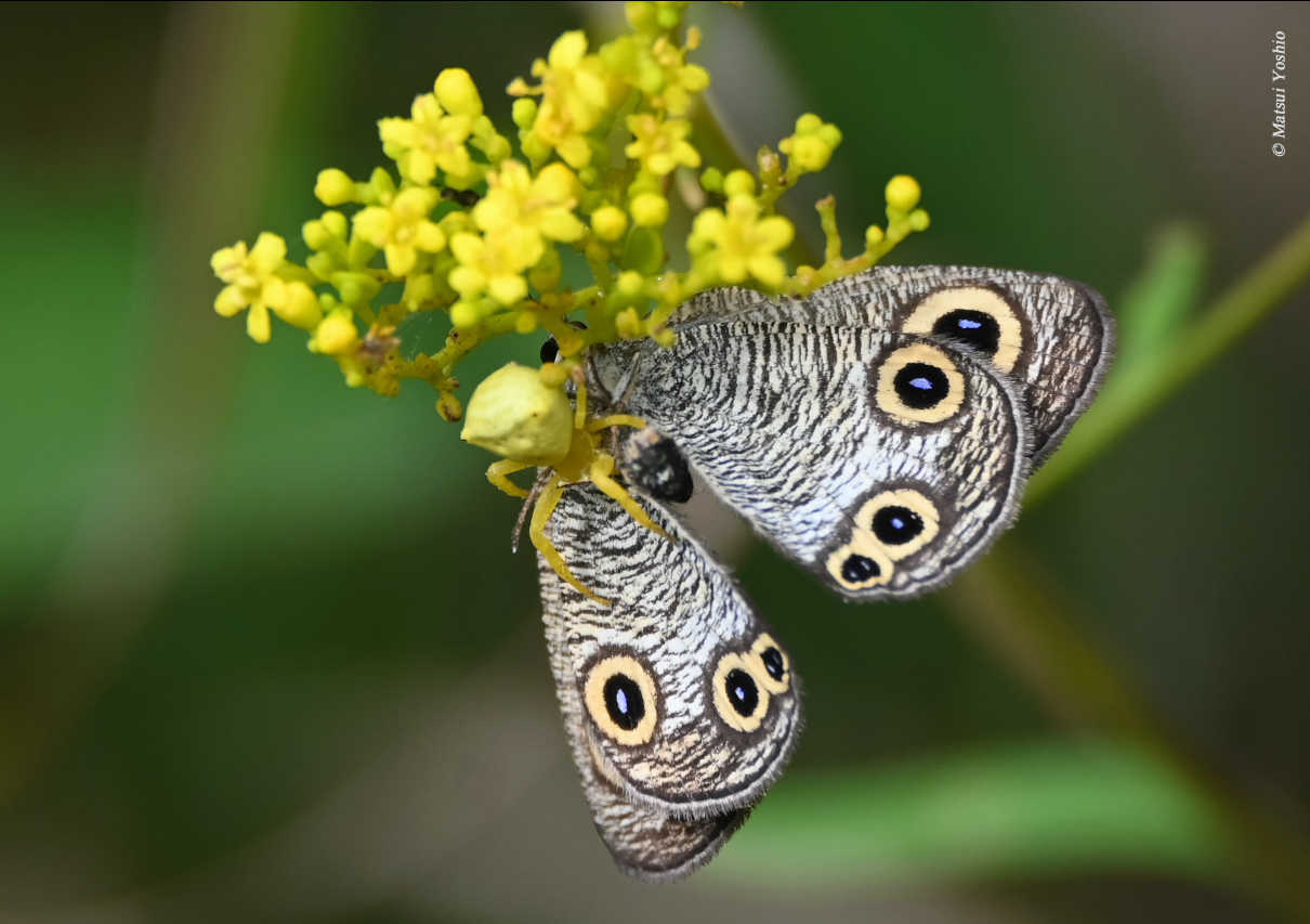 アズチグモに捕らわれたウラナミジャノメ 撮影:松井慶夫