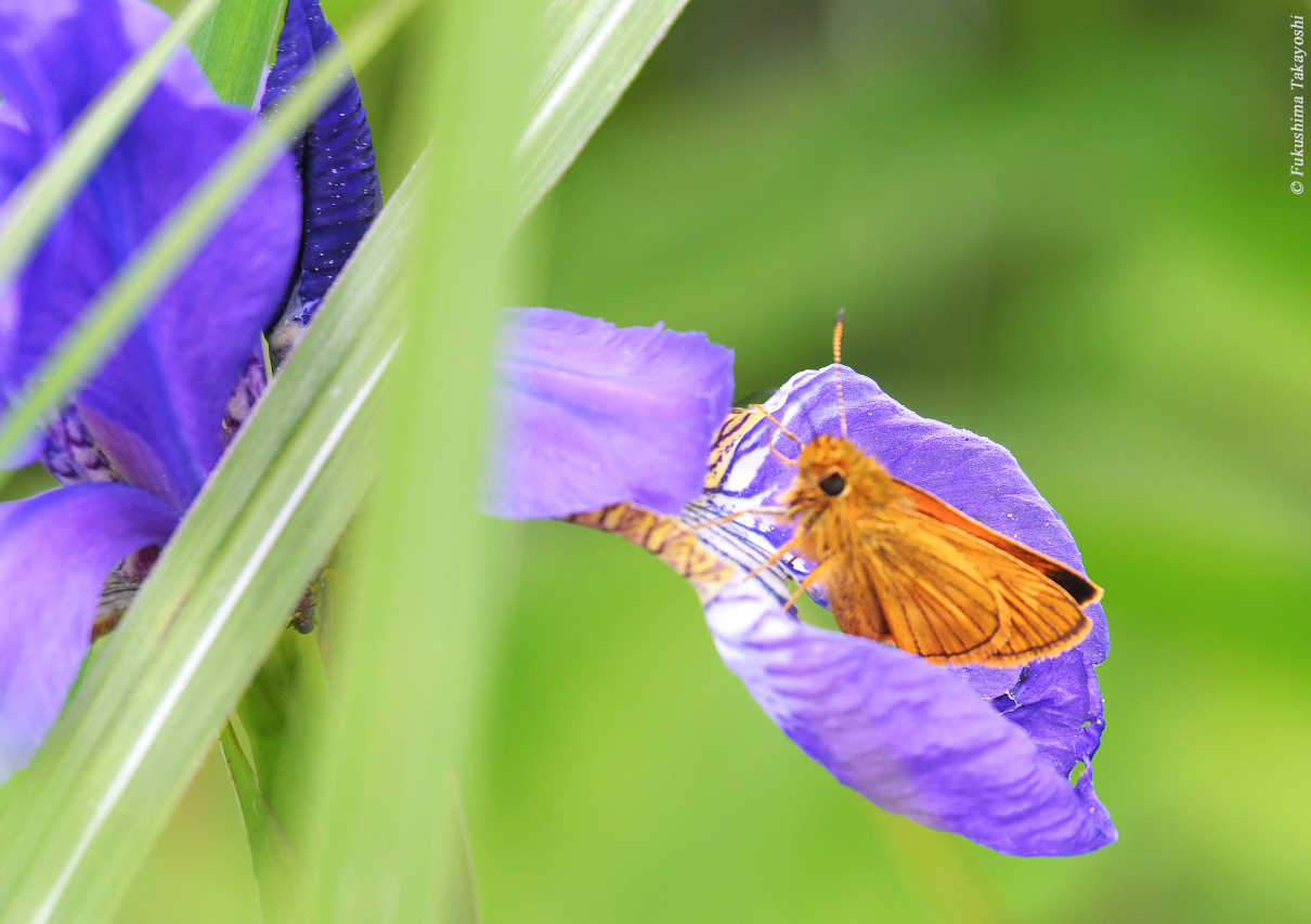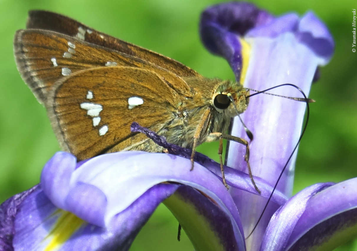 アヤメのベッドで一休みの ヒメキマダラセセリ 撮影:福島孝好