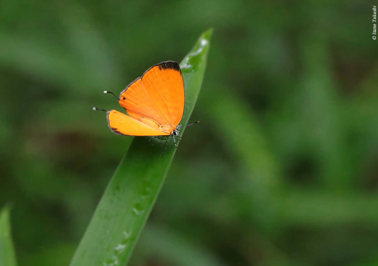 雨上がりの暗い林床を歩いていると、ほんの一瞬、鮮やかなオレンジ色が輝くのが見えました。飛翔以外では滅多に翅を開かないウラナミアカシジミ。ところが、なぜかこの個体は数十秒間隔でパッと一瞬だけ翅を開くことを繰り返していました。この千載一遇のチャンスを逃すまいとタイミングを見計らってひたすら連射した結果、何枚か翅表を写しとめることができました。