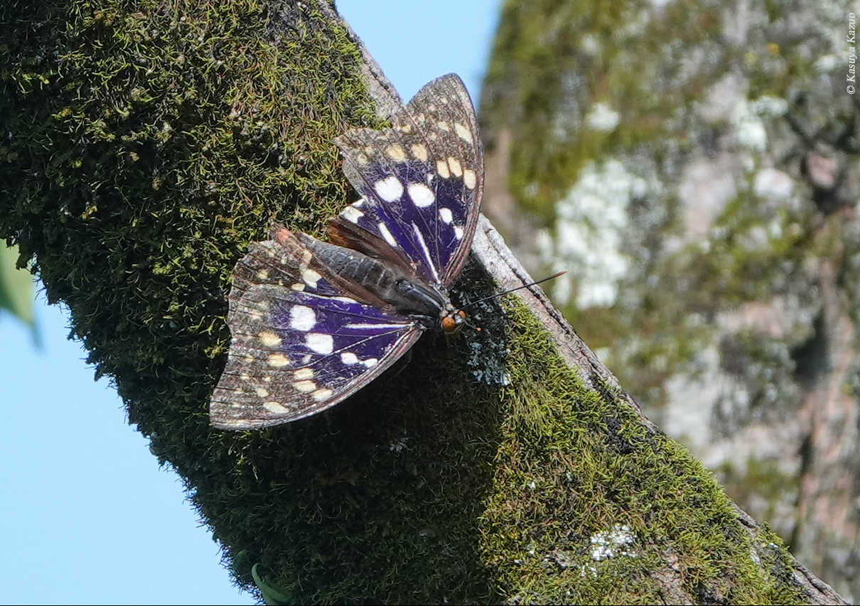 大きな渓谷の彼方に太陽の光を受けて真珠色に輝く斑点がチラチラと舞っていた。その一つが突然目の前に飛び込むと下藪に隠れた。ウラクロシジミのオスだった。翅摺りで時折垣間見せる翅表が青白く輝いていた。占有行動時間である夕刻には激しく飛廻るだけのこの蝶が、ゆったりと佇んでいる姿を眼前で観ることができたのは、初夏昼前の嬉しいひとときであった。