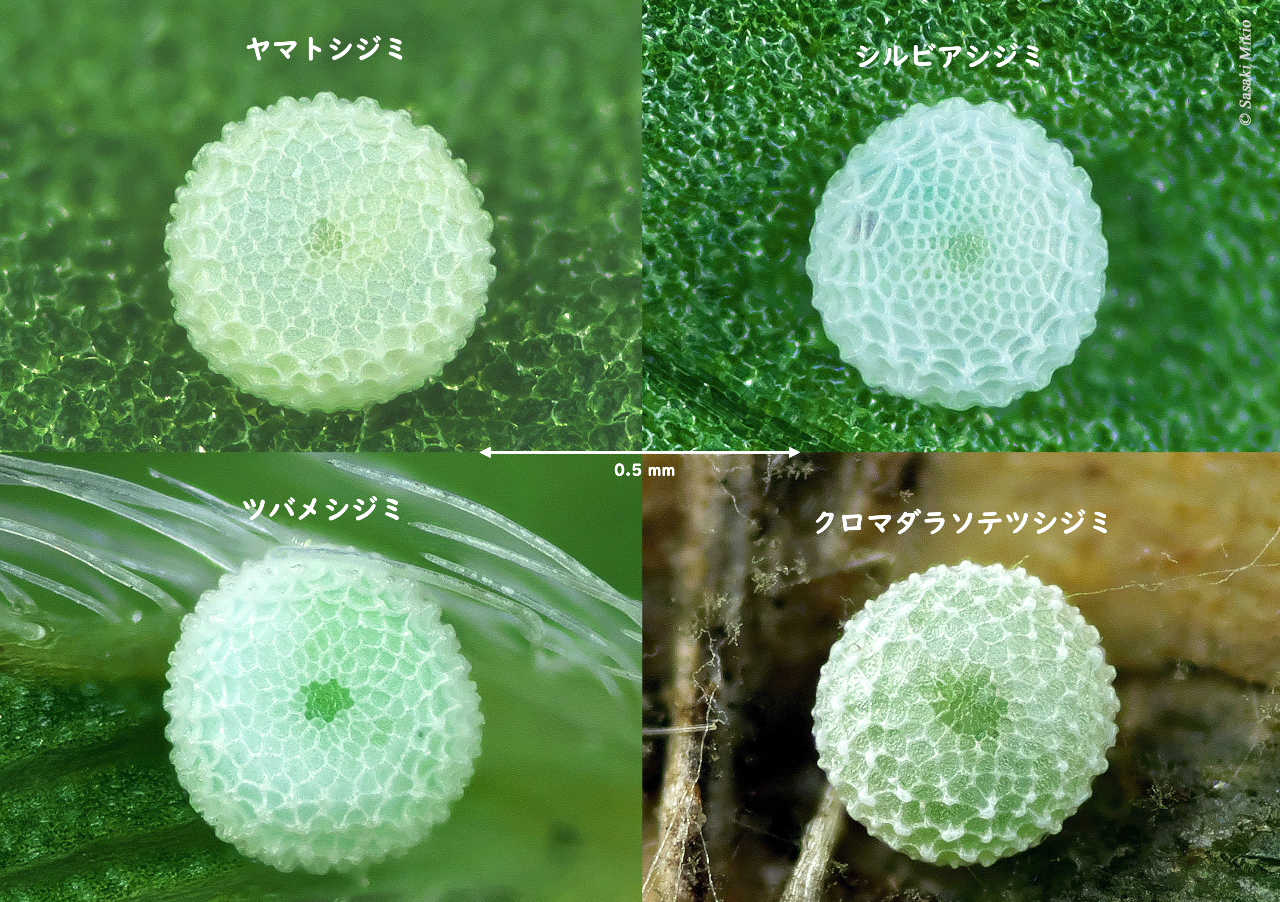 シジミチョウの卵は拡大してみると、とても複雑な模様が観察できます。1mmに満たない卵の表面に、まるでミクロの彫刻師が卵の上に舞い降りて彫ったのか?と錯覚してしまう位、精緻な構造です。ヒメシジミ族の卵はいずれもレース模様のような綺麗な網目構造が特徴です。別種でありながら、どうしてこんなに似ているのだろう・・・と驚いてしまいます。通常のマクロレンズでは撮影が困難なため、特殊なレンズ系を用い、数十枚ピントをずらして撮影し、コンピューター上で合成して、微構造を明らかにしました。