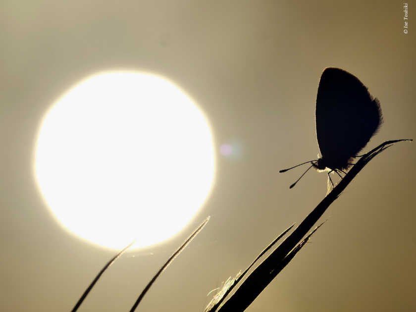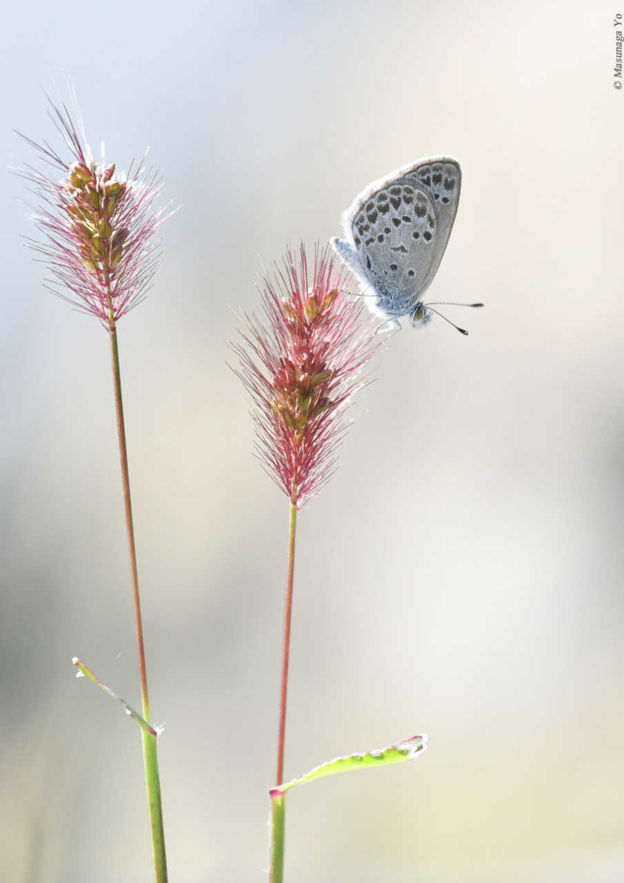 個体数は少ないが時々クロシジミが観察される里山で、今年はオスが2頭で追いかけているのが見られ、ひょっとして近くへ止まるかと期待して近づいたら、タイミング良く止まって翅を広げてくれた。ススキの上だったので下から見る格好となってしまったが、後にも先にも近くに止まったのは、この日のこの一瞬だけだった。