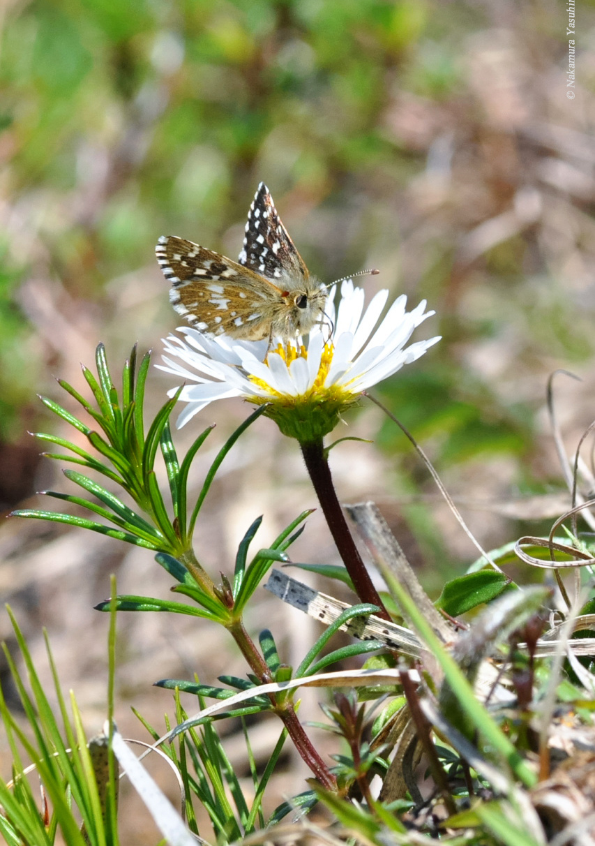 アポイアズマギクで吸蜜する ヒメチャマダラセセリ 撮影:中村康弘