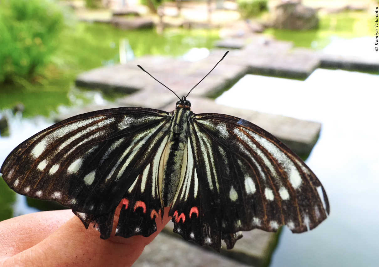 主にチョウを指に留めて、背景を考慮して移動して撮った写真を「この指とまれ」写真と称して撮っている者です。自宅近くの公園で、見慣れないチョウを見つけ、指に留め、お気に入りの日本庭園にまで移動して、撮ったものです。 撮影後アカボシゴマダラの黒化型と判明した為、珍しい記念写真として宝物にしている写真の一枚です。