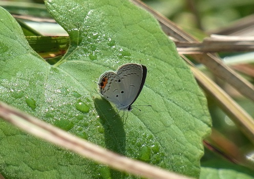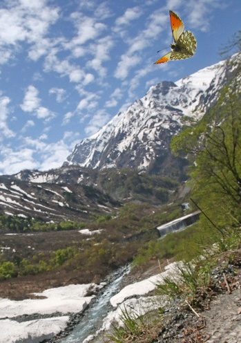 北アルプスの沢沿いの登山道を詰めて行くと、上流部の草付でタカネキマダラセセリに会うことができます。午前中、オスはイタドリや食草のイワノガヤスリなどの葉上でテリトリーを張っている姿が見られます。そこに別のオス個体が飛来するとジェット戦闘機のスクランブル発進のような勢いで飛び立ち、ごく短時間ですがオス同士が絡み合って飛ぶ姿が見られます。写真を撮った時には気が付かなかったのですが、よく見るとオスが脚同士をぶつけ合っている、まさに肉弾戦だったことに驚きました。