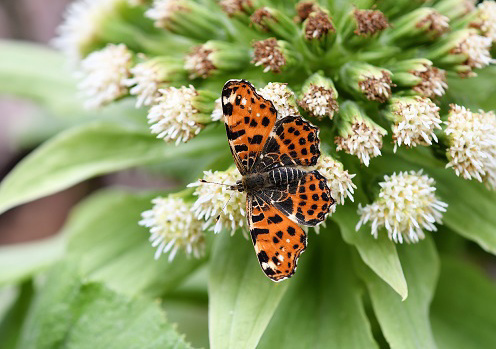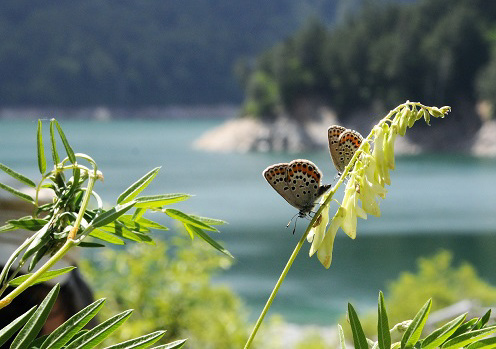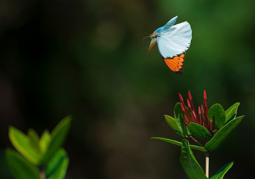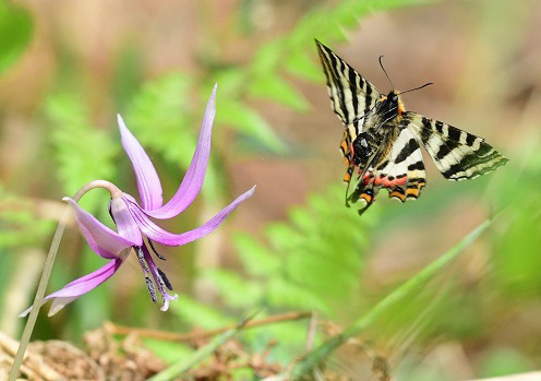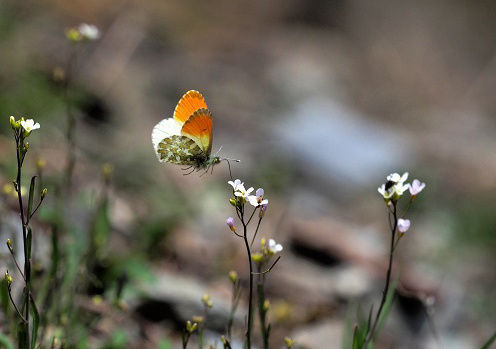 クモマツマキチョウは可憐で美しい高山蝶で、幼虫の食草ミヤマハタザオなどに良く訪花します。偶然、ミヤマハタザオの花で吸蜜するためにストローを伸ばしながら、飛びつく瞬間の写真が撮影できました。