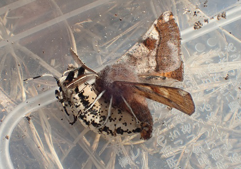 2016年に約30年ぶりに発見されたフユシャク超レア種(絶滅危惧Ⅰ類)で雄は高速飛翔で通常撮れない種です。飼育処女雌フェロモンで野生雄をおびき寄せての撮影が現実的方法です。迫力あるシーンです。