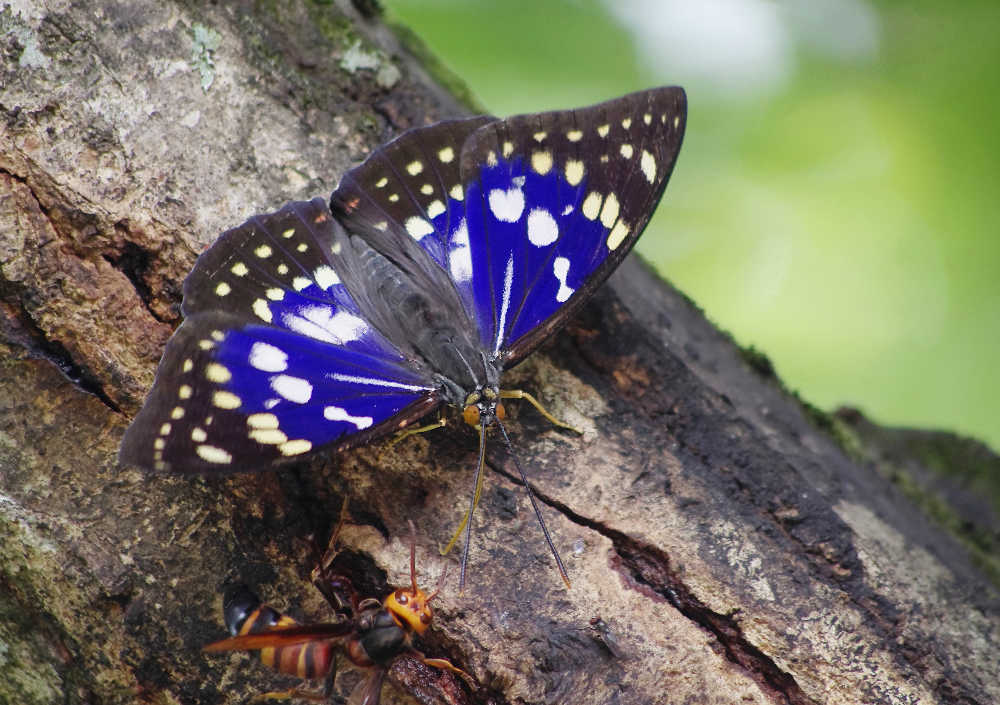 8月中旬の台風の後、迷蝶が時々記録される場所に行ってみると2頭のリュウキュウムラサキを観察する事が出来た。1頭は傷んでいたがもう1頭は割と新鮮な雄であった。これらの個体は7月ぐらいに飛んで来た個体の子供だろうと思った。気温が高いので次の世代が見られるかもと期待して10月上旬に再訪してみたら裏面白帯の発達した個体に会うことが出来た。
