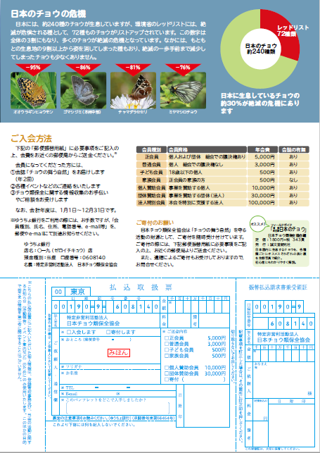 口座番号:0608140 名義:特定非営利活動法人 日本チョウ類保全協会